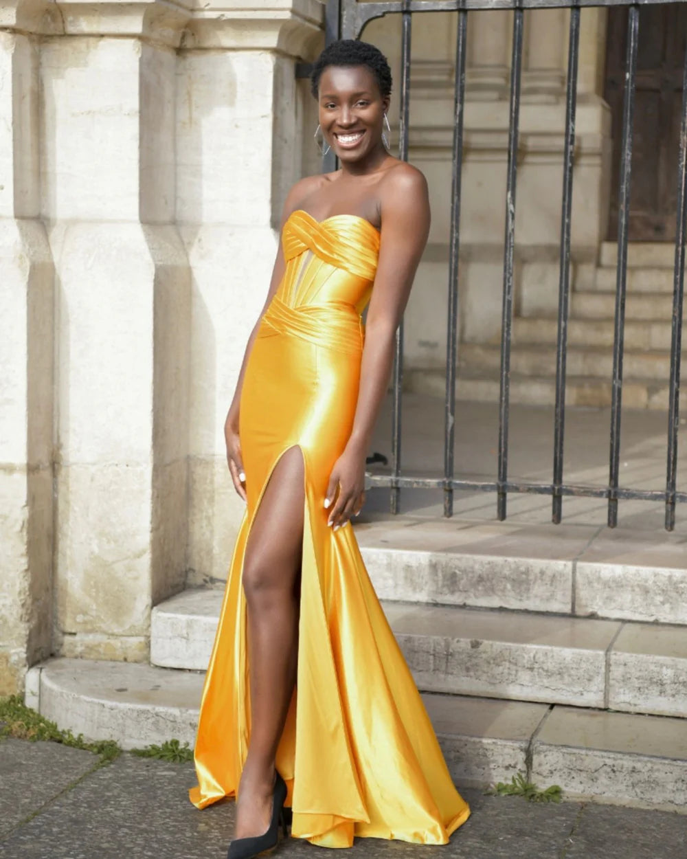 Vestido largo y ajustado. Tejido satinado muy brillante y con caída. Escote de palabra de honor, con drapeado en forma de infinito. Obertura en pierna. Espalda regulable con cintas y cierre con cremallera baja. Frunces en parte trasera.