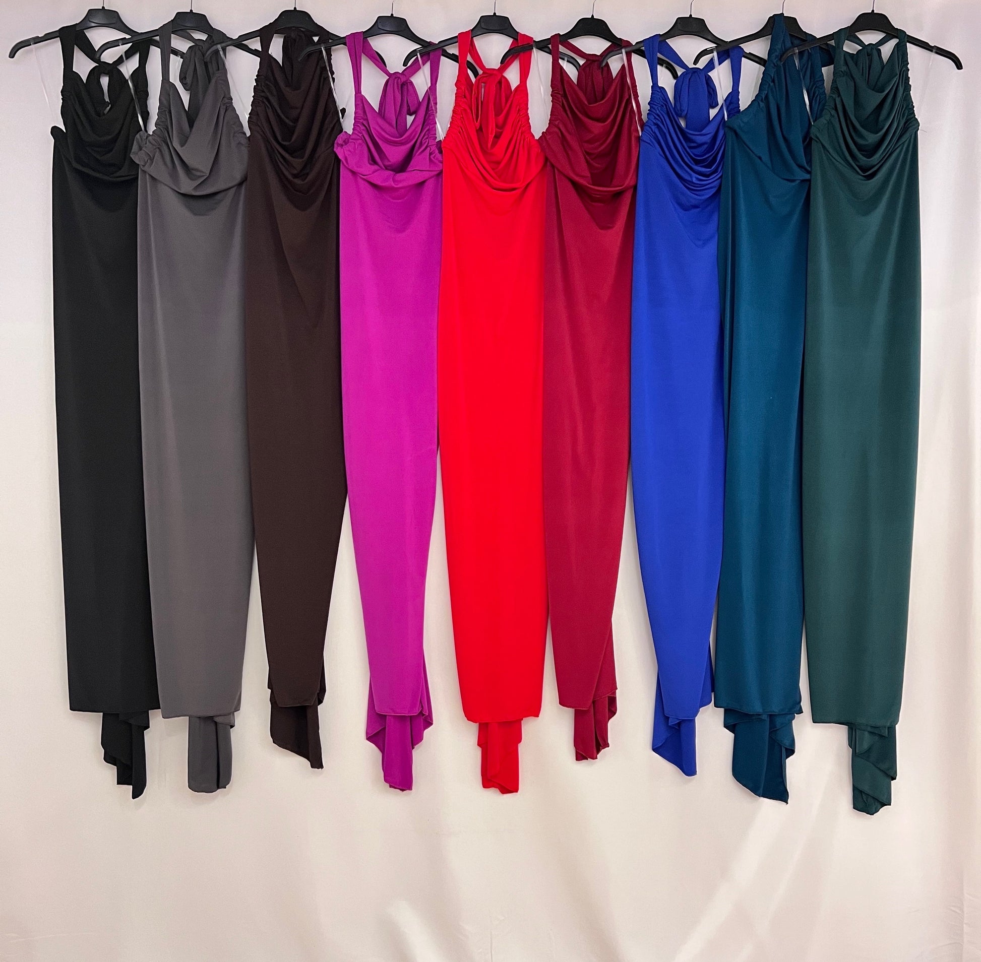 Vestido largo elástico y ajustado con escote ajustable drapeado. Se anuda al cuello en la espalda con un lazo. Espalda descubierta y fruncido en glúteo.